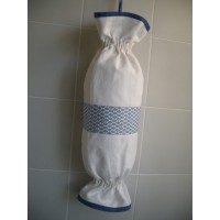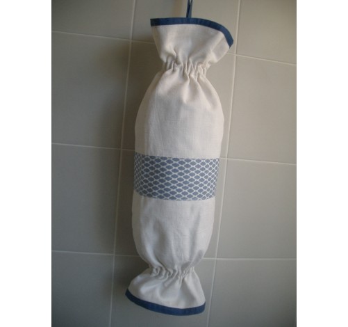 Articolo FATTO A MANO in pregiata tela grezza tessuta artigianalmente con applicazioni colorate e asola per poter appendere il portasacchetti - dai due lati chiusura elastica morbida