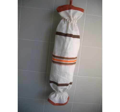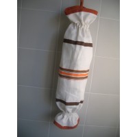 Articolo FATTO A MANO in pregiata tela grezza tessuta artigianalmente con applicazioni colorate e asola per poter appendere il portasacchetti - dai due lati chiusura elastica morbida