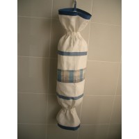 Articolo FATTO A MANO in pregiata tela grezza tessuta artigianalmente con piccole inperfezioni naturali del tessuto grezzo e con applicazioni colorate e asola per poter appendere il portasacchetti - dai due lati chiusura elastica morbida