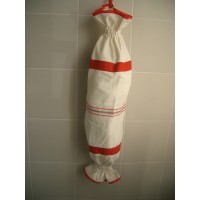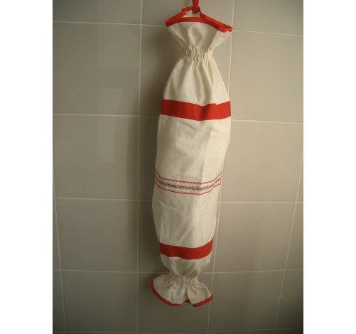Articolo FATTO A MANO in pregiata tela grezza tessuta artiginalmente con piccole inperfezioni naturali del tessuto grezzo e con applicazioni colorate e asola per poter appendere il portasacchetti - dai due lati chiusura elastica morbida