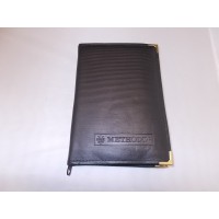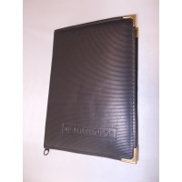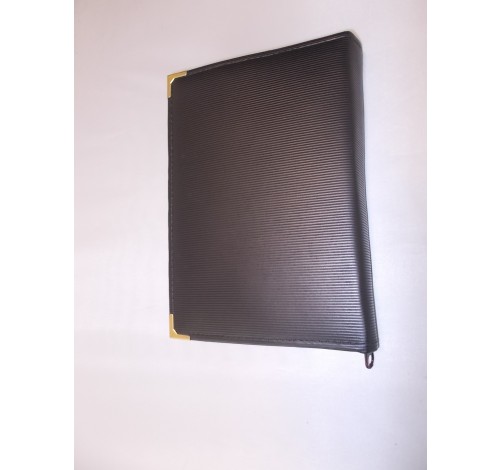 Astuccio in similpelle e cuciture laterali, angoli rinforzati da bordo metallico color oro e pratica chiusura con cerniera