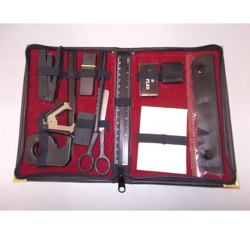 Interno con tessuto vellutino color bordeaux ed elastici neri per contenere i vari articoli dell'astuccio :