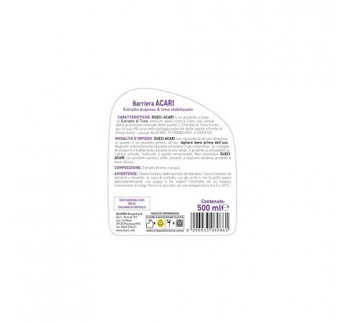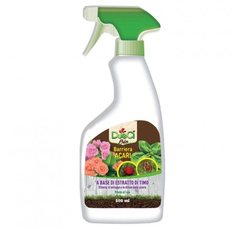 Dueci Acari è un prodotto a base di Estratto di Timo ottenuto dalla ricerca Dueci nel campo della protezione naturale delle piante. L’Estratto di Timo è noto per la sua efficacia nello sviluppo naturale delle piante a fronte di stress biotici causati da ACARI, TETRANICHIDI e ERIOFIDI. Dueci Acari non necessita di alcuna diluizione in quanto è un prodotto pronto all’uso. Agitare bene prima dell’uso. Bagnare uniformemente la pianta ed evitare il gocciolamento. Si consiglia di eseguire il trattamento durante le ore serali. Il prodotto è utilizzabile su colture orticole, frutticole e piante ornamentali. Non miscelare Dueci acari con prodotti rameici, zolfo, prodotti a reazione alcalina, prodotti a base oleosa.