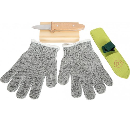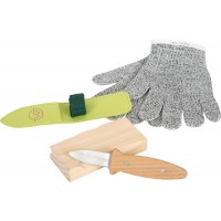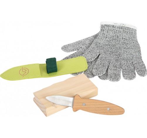 Dimensioni : coltello ca. 13 x 3 x 1 cm, blocco di legno ca. 10 x 5 x 2 cm, misura dei guanti: XS (classe di protezione antitaglio 5)